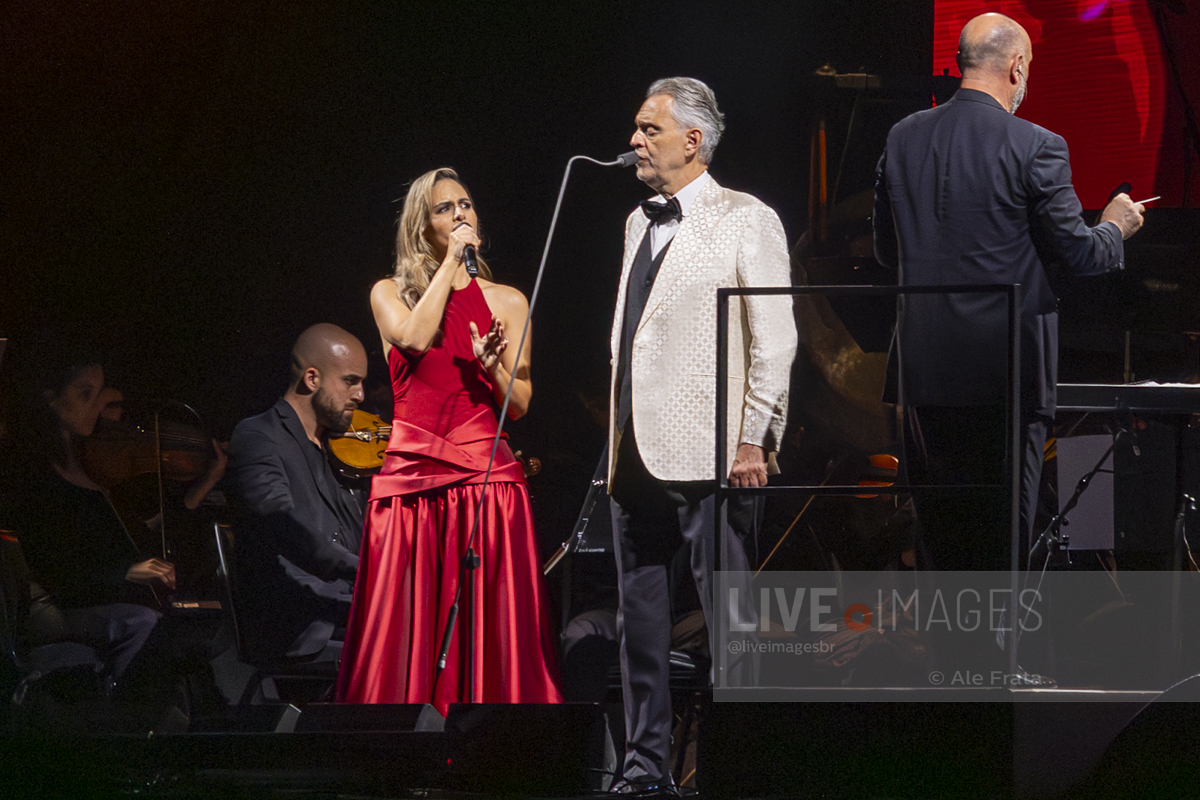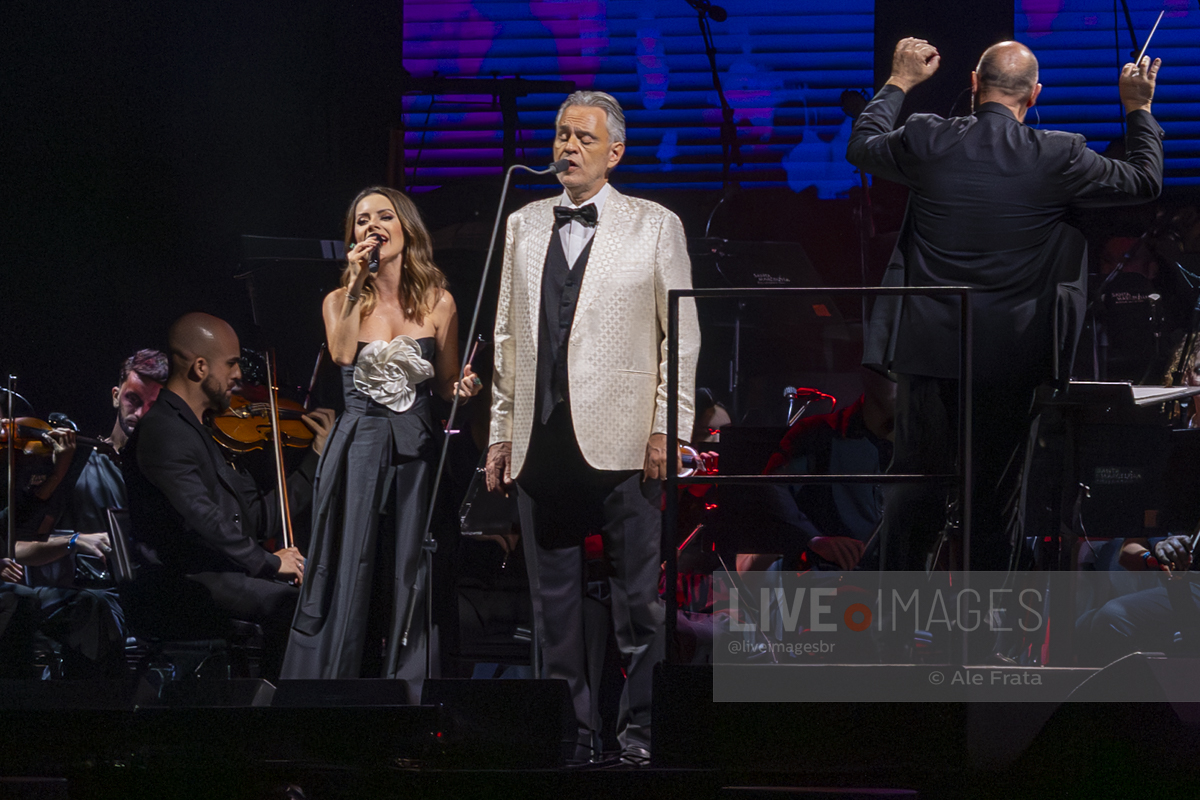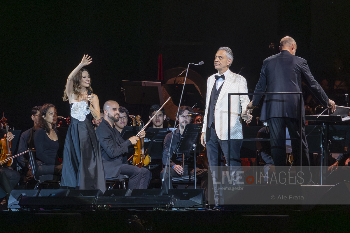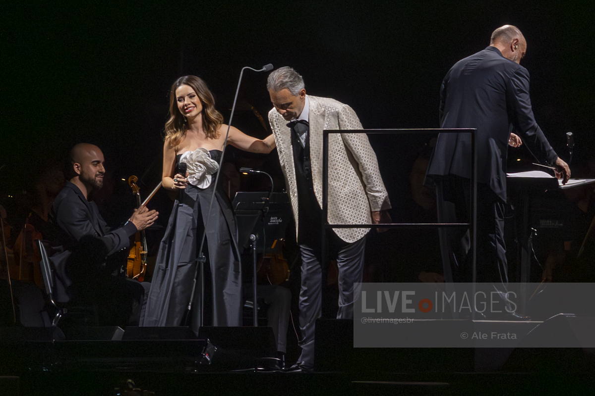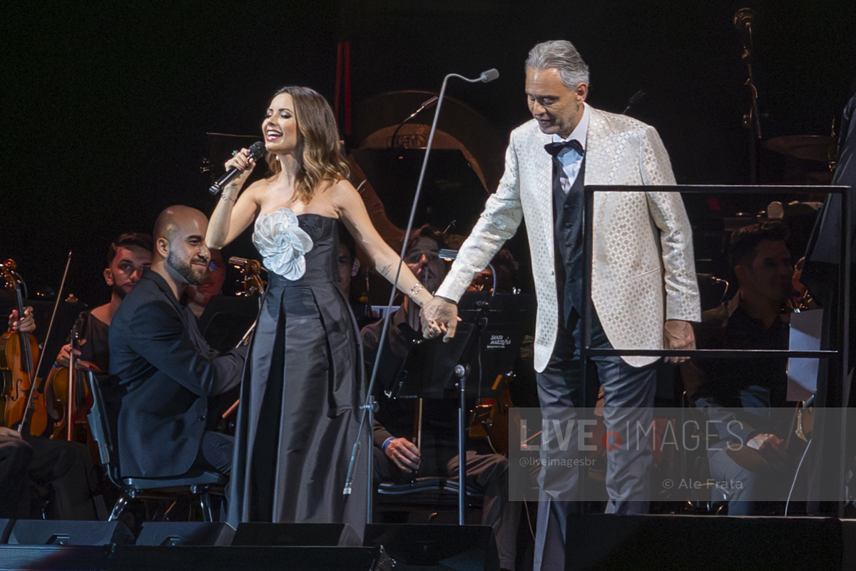 O momento mais esperado da noite foi o reencontro entre Andrea Bocelli e Sandy. A artista brasileira, visivelmente emocionada, subiu ao palco para reascender a chama da parceria que já é querida pelo público. Sandy não apenas solou o sucesso “Me Espera” (demonstrando a força de sua própria carreira), mas também formou um dueto impecável com o tenor no clássico “Vivo por ella / Vivo per lei”, elevando a energia da Arena.