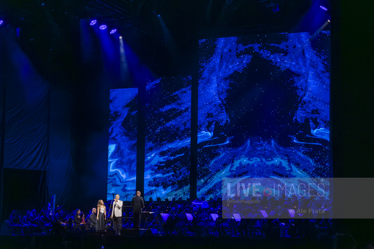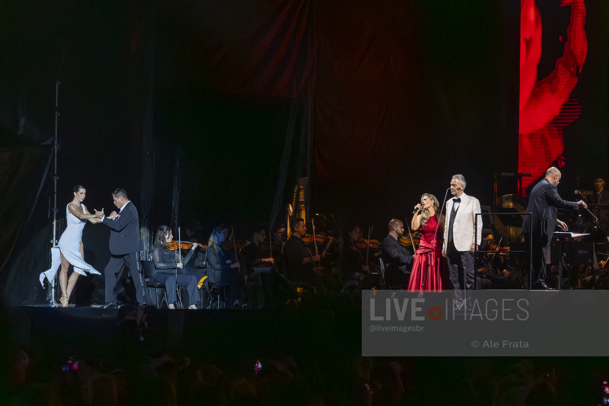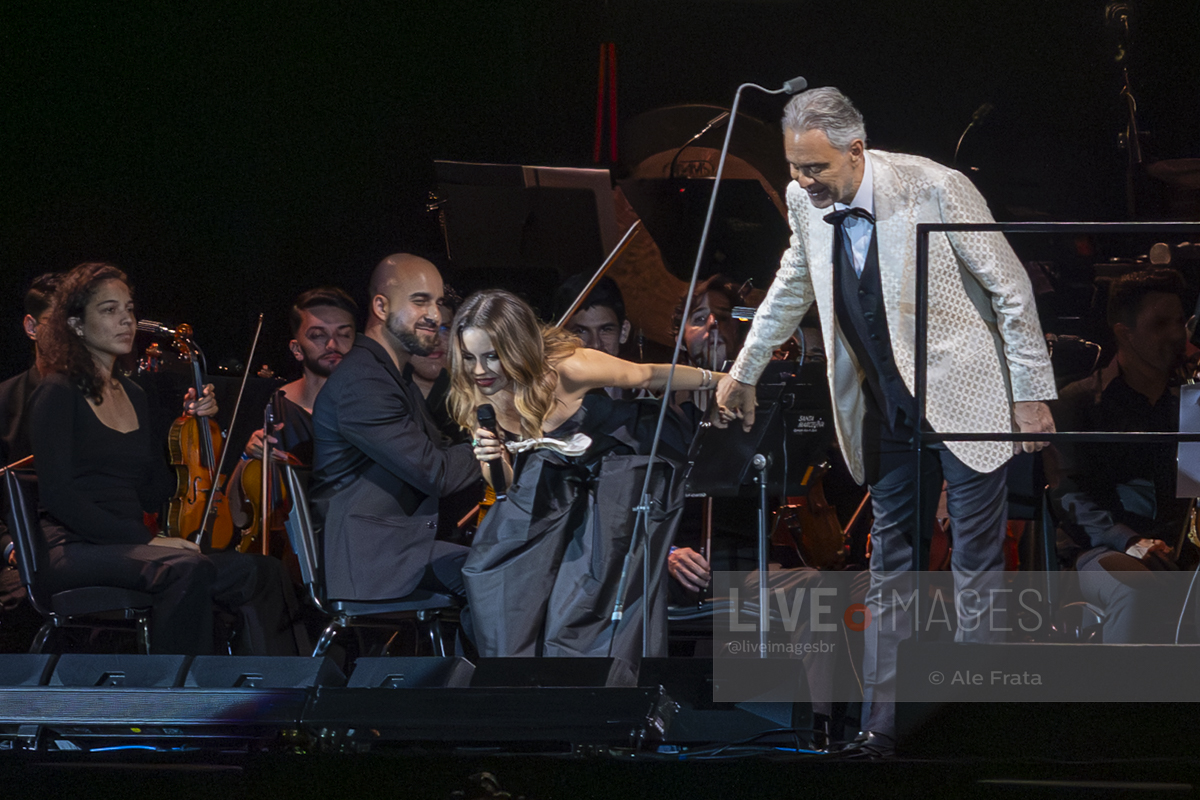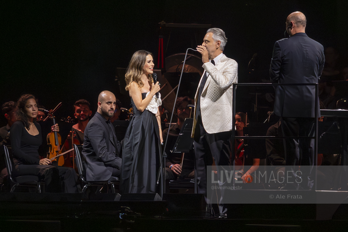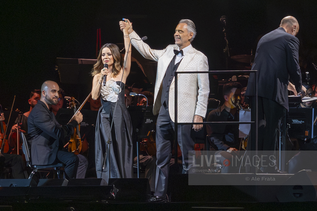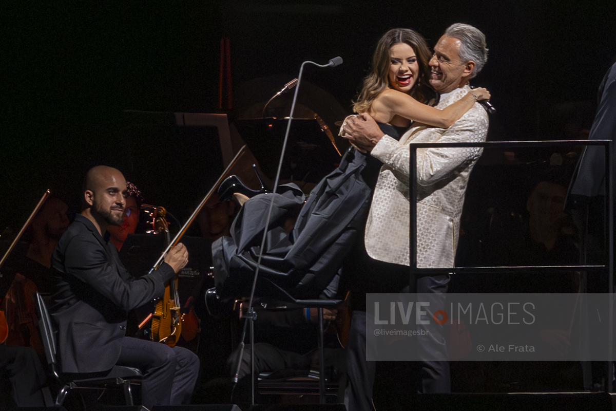 O momento mais esperado da noite foi o reencontro entre Andrea Bocelli e Sandy. A artista brasileira, visivelmente emocionada, subiu ao palco para reascender a chama da parceria que já é querida pelo público. Sandy não apenas solou o sucesso “Me Espera” (demonstrando a força de sua própria carreira), mas também formou um dueto impecável com o tenor no clássico “Vivo por ella / Vivo per lei”, elevando a energia da Arena.