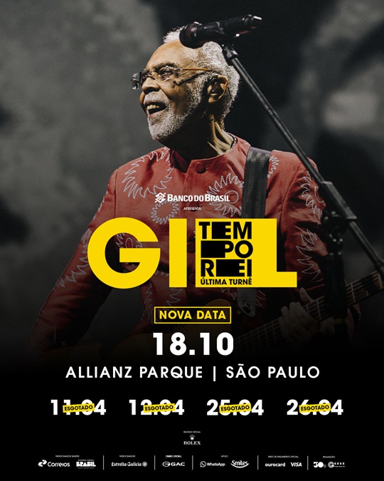 Quando migrou para São Paulo, em 1965, Gilberto Gil ainda não se dedicava inteiramente à música, mas foi na cidade que ele começou a mostrar o seu talento para todo o Brasil, ao se destacar no programa O Fino da Bossa, exibido pela Record e apresentado por Elis Regina. A turnê TEMPO REI marca o retorno de Gil — 60 anos depois — para a capital paulista, e de forma emblemática, com quatro noites (11, 12, 25 e 26 de abril) com sold out de ingressos e 200 mil pessoas no Allianz Parque, na Zona Oeste de São Paulo, contemplando a arte de Gil em 2 horas e 30 minutos de show. Agora, a cidade que foi palco de tantos momentos especiais da carreira de Gil, ganha mais uma oportunidade de celebrar sua musicalidade, no dia 18 de outubro de 2025, quando ele retorna ao Allianz Parquecom um show extra da tour.